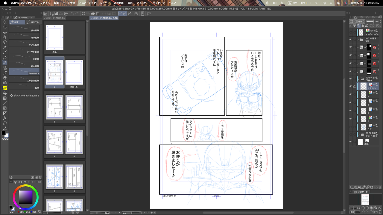 キャラクターを下書きし、セリフの位置を固め、最後に吹き出しを下書きします